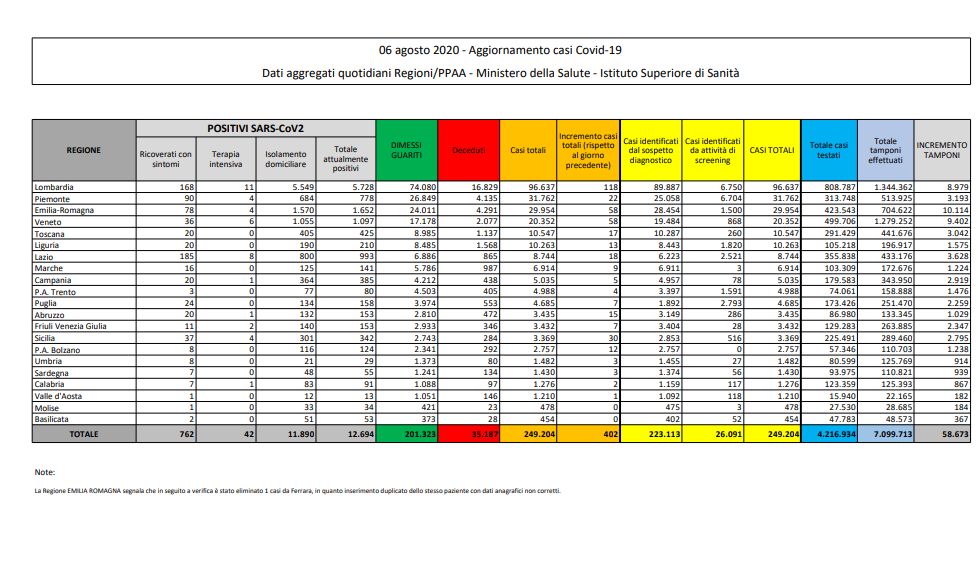 ROMA (ITALPRESS) – Aumento dei contagi in Italia. I nuovi positivi nelle ultime 24 ore sono 402, 18 in più rispetto a ieri. Un numero che porta a 249.204 il totale dei contagiati dall’inizio della pandemia. Diminuiscono i decessi, 6 contro i 10 registrati ieri. Lo riporta il bollettino quotidiano del Ministero della Salute.