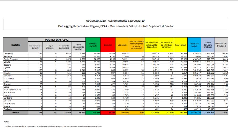Il numero totale di attualmente positivi è di 13.263, con un incremento di 310 assistiti rispetto all’8 agosto. Tra gli attualmente positivi, sono 45 (+2) in cura presso le terapie intensive. 763 persone sono ricoverate con sintomi, con un decremento di 8 pazienti rispetto all’8 agosto. 12.455 persone sono in isolamento senza sintomi o con sintomi lievi. Rispetto al giorno precedente i nuovi deceduti sono 2 e portano il totale a 35.205. Il numero complessivo dei dimessi e guariti sale invece a 202.098, con un incremento di 151 persone rispetto all’8 agosto. Il numero di tamponi effettuati nelle ultime ventiquattro ore ammonta a 37.637 (ieri 53.298), per un totale di 7.249.844.
