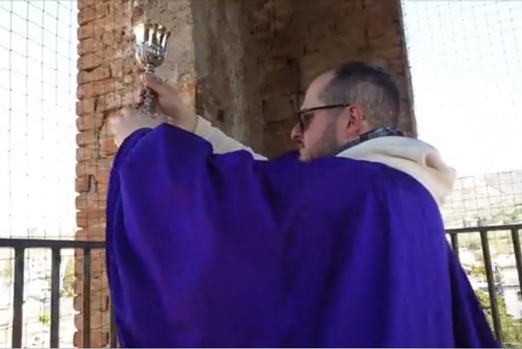 Nella terza domenica di Quaresima, la prima in quarantena anche per il mondo religioso, con tutti gli edifici sacri costretti alla chiusura secondo le disposizioni del Governo per limitare il diffondersi del coronsavirus, Don Filippo Milli ha voluto celebrare la tradizionale funzione domenicale in cima al campanile della Chiesa parrocchiale.