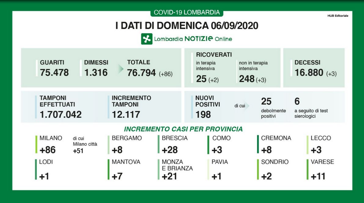Passando alle province, a Milano si registrano 86 nuovi casi, di cui 51 a Milano città. A Bergamo 8, Brescia 28, Como 3, Cremona 8, Lecco 3, Lodi 1, Mantova 7, Monza e Brianza 21, Pavia 1, Sondrio 2 e Varese 11.