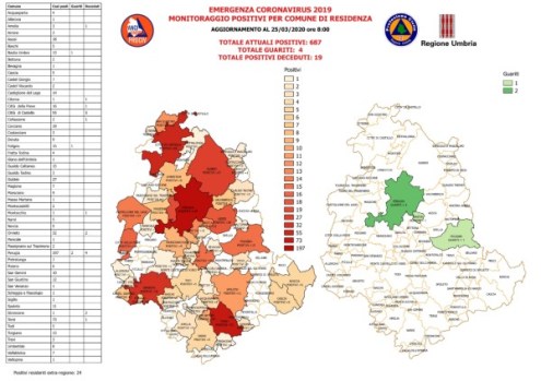 Acquasparta (4 casi), Allerona (1), Amelia (3 casi, 1 decesso), Arrone (3), Assisi (18), Baschi (5), Bastia Umbra (13 casi, 1 guarito), Bettona (2), Bevagna (1), Cascia (5), Castel Giorgio (7), Castel Viscardo (2), Castiglione del Lago (14), Citerna (1 caso, 1 decesso), Città della Pieve (16 casi, 1 decesso), Città di Castello (57 casi, 5 decessi), Collazzone (2 casi, 1 decesso), Corciano (19), Costacciaro (3), Deruta (9), Foligno (15, 1 persona guarita), Fratta Todina (4), Giano dell’Umbria (1), Gualdo Cattaneo (15), Gualdo Tadino (3), Gubbio (27), Magione (7), Marsciano (9), Massa Martana (1), Montecastrilli (2), Montecchio (1 caso, 1 decesso), Narni (5), Norcia (5), Orvieto (32, 1 decesso), Panicale (2), Passignano sul Trasimeno (2), Perugia (197 casi, 2 guariti e 4 decessi), Pietralunga (1), Porano (6), San Gemini (10), San Giustino (12), San Venanzo (1), Scheggia e Pascelupo (1), Sigillo (1), Spoleto (11, anche se una persona è in realtà guarita), Stroncone (1, 2 persone decedute), Terni (73, 1 decesso), Todi (5), Torgiano (13), Trevi (3), Umbertide (8), Valfabbrica (7), Valtopina (1). Positivi extra regione: 24.