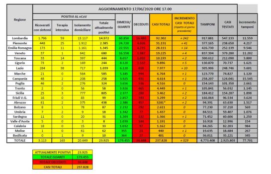 ROMA (ITALPRESS) – A oggi il totale delle persone che hanno contratto il virus è di 237.828, con un incremento rispetto a ieri di 329 nuovi casi. Lo rende noto la Protezione Civile.