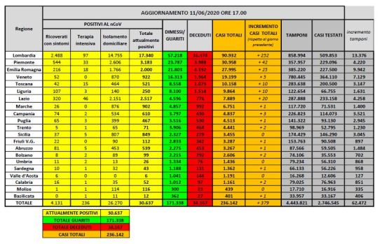 Rispetto al 10 giugno i deceduti sono 53 e portano il totale a 34.167. Il numero complessivo dei dimessi e guariti sale invece a 171.338, con un incremento di 1.399 persone rispetto al 10 giugno.