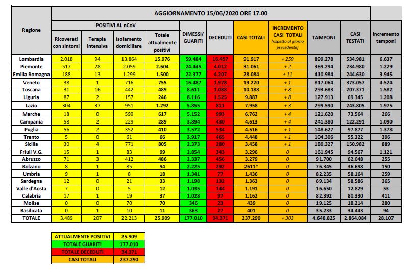 Rispetto al 14 giugno i deceduti sono 26 e portano il totale a 34.371. Il numero complessivo dei dimessi e guariti sale invece a 177.010, con un incremento di 640 persone rispetto al 14 giugno.