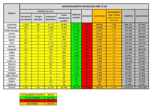 Rispetto al 4 giugno i deceduti sono 85 e portano il totale a 33.774. Il numero complessivo dei dimessi e guariti sale invece a 163.781, con un incremento di 1.886 persone rispetto al 4 giugno.