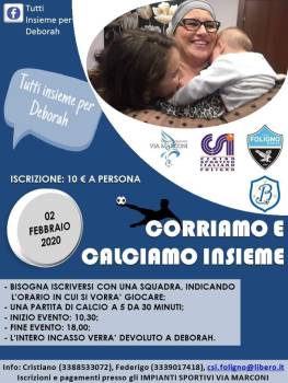 Si chiama “Corriamo e calciamo insieme” l’iniziativa promossa dagli Impianti Sportivi via Marconi, dal Centro Sportivo Italiano di Foligno in collaborazione con le società sportive Foligno calcio a 5 e Blasone per raccogliere offerte da destinare a Deborah Bonucci, la mamma di Sant’ Eraclio che ha bisogno di cure costose per curarsi.