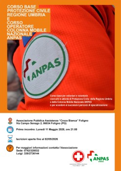 Il Corso base per volontari e volontarie è organizzato dall’Associazione Pubblica Assistenza “Croce Bianca” Foligno e da ANPAS Umbria. Sarà condotto da formatori iscritti all’albo nazionale e darà accesso ai successivi percorsi di specializzazione.