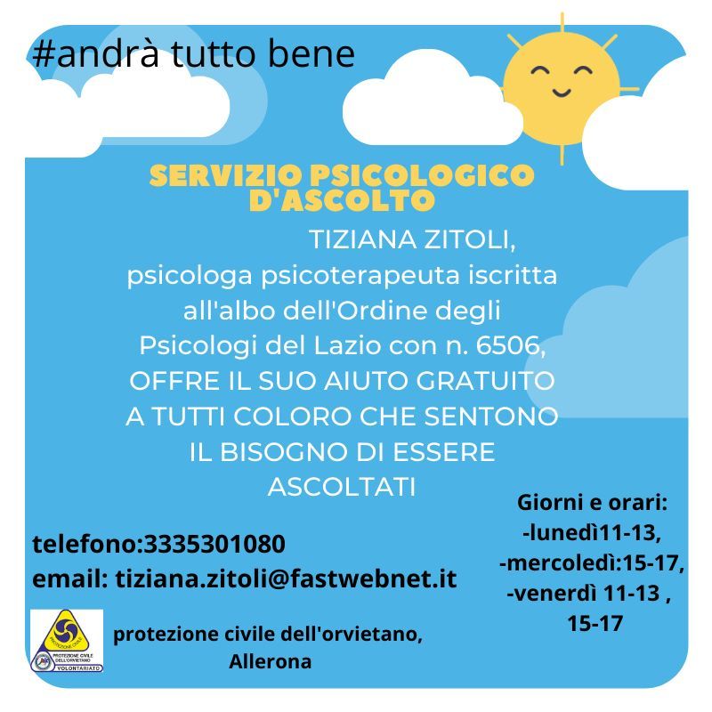 Avvalendosi della professionalità volontaria della psicologa psicoterapeuta, Tiziana Zitoli, mette a disposizione di tutti coloro che ne sentano la necessità, un numero che è possibile chiamare il lunedì e venerdì dalle 11 alle 13 e il mercoledì e venerdì dalle 15 alle 17.