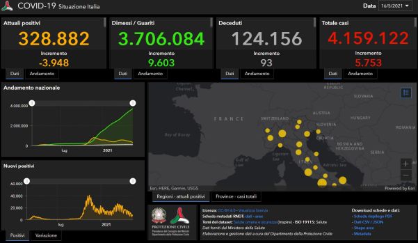 Con quelli di oggi diventano 4.159.122 i casi totali di Covid in Italia. Attualmente i positivi sono 328.882 (-3.948), 314.969 le persone in isolamento domiciliare. I ricoverati in ospedale con sintomi sono 12.134 di cui 1.779 in Terapia intensiva. I dimessi/guariti sono 3.706.084 con un incremento di 9.603 unità nelle ultime 24 ore.