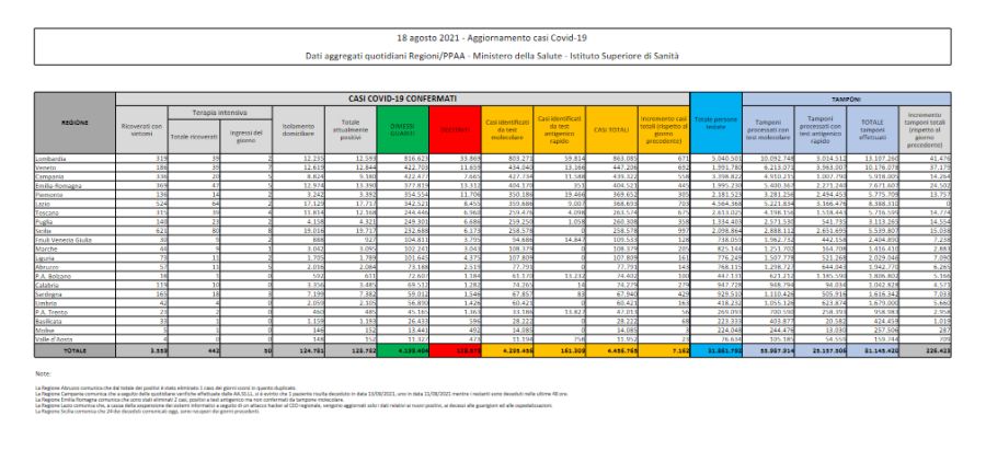 in 24 ore. Lo riferisce il ministero della Salute. Sono 226.423 i tamponi molecolari e antigenici per il coronavirus effettuati nelle ultime 24 ore in Italia. Il tasso di positività è del 3,1%. Gli attualmente positivi conteggiati in Italia sono 128.782 e di questi 3.559 ricoverati con sintomi e 442 in terapia intensiva. Le persone sottoposte a isolamento domiciliare sono 124.781.