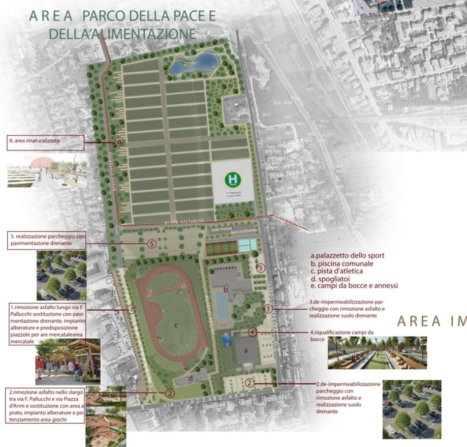 Per accedere al bando viene prevista “la rimozione di parcheggi attualmente in buono stato – come quelli sopra il PalaRota o in prossimità della pista di atletica – al solo scopo di renderli permeabili. Lungo via F. Pallucchi, nell’area mercatale, l’asfalto verrebbe sostituito con pavimentazione drenante, mentre vaste aree verdi, rappresentate nei disegni progettuali come semplici rettangoli, potrebbero trasformarsi in orti ecosolidali, senza che vi sia alcuna indicazione chiara e ufficiale in merito. Un progetto calato dall’alto, privo di un reale confronto pubblico. Anche scelte discutibili, come la collocazione di un laghetto in prossimità delle abitazioni – con evidenti rischi igienico-sanitari nei mesi estivi – non risultano accompagnate da spiegazioni o valutazioni tecniche accessibili. Gravissima è poi l’assenza di qualsiasi indicazione sulla manutenzione futura dell’area. Con quali risorse si intende garantire la gestione ordinaria del Parco, quando già oggi il Comune fatica a mantenere strade, giardini e cimiteri? Il rischio è quello di realizzare l’ennesima opera nuova destinata rapidamente al degrado.