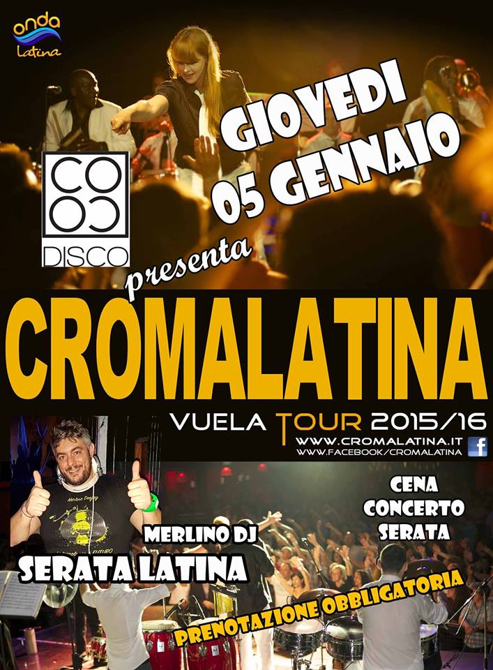 Una serata super, che si svolgerà nella sala grande, in cui sarà possibile cenare e poi assistere al concerto dei Croma Latina, uno dei gruppi live più accreditati per questo genere di musica. Alla fine del concerto Merlino Dj farà ballare tutti gli appassionati fino all’alba al ritmo di salsa e merengue. Naturalmente la cena è solo su prenotazione mentre il concerto è previsto nell’immediato dopo cena,  per permettere la presenza anche di chi non fosse interessato alla cena.