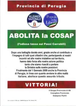 A decorrere da domani, 1° gennaio '09, scompare il Cosap per i passi di accesso carrabili verso le civili abitazioni e le attività commerciali. E' questa la principale novità contenuta nel Nuovo Regolamento generale delle entrate della Provincia di Perugia che, in una delle ultime sedute del Consiglio provinciale, ha subito delle modifiche e integrazioni. Modifiche relative appunto in particolar modo al titolo III “Canone occupazione spazi e aree pubbliche”, che erano stato proposte con un ordine del giorno unificato (a firma dei Capigruppo del PD Lazzaro Bogliari, del Partito Socialista-PSE Lorenzo Delle Grotti, del Gruppo Misto Luigi Andreani, di FI Ivo Fagiolari, di AN Bruno Biagiotti), nel Consiglio provinciale dello scorso 30 settembre. Con le modifiche recentemente apportate al Regolamento delle entrate (atto approvato dall'assemblea consiliare di Piazza Italia con il parere favorevole di tutti i gruppi, fatta eccezione per il Prc che si è astenuto), il documento è stato anche adeguato alle normative vigenti in materia. Pertanto, a decorrere dal 1° gennaio 2009, sono esenti dall'applicazione del Canone le occupazioni effettuate per gli accessi carrabili. Altre esenzioni sono state introdotte anche per una serie di occupazioni quali quelle effettuate per finalità istituzionali dallo Stato, dalle Regioni, dagli Enti Locali e loro Consorzi, da Enti religiosi per l'esercizio dei culti ammessi nello Stato, da organizzazioni non lucrative di utilità sociale, dalle vetture destinate al servizio di trasporto pubblico di linea in concessione durante le soste o nei posteggi ad esse assegnati, per il servizio di raccolta e smaltimento dei rifiuti solidi urbani, le occupazioni temporanee da parte di associazioni non aventi scopo di lucro. “Questo provvedimento – ha commentato l'assessore provinciale al bilancio Daniela Frullani – va incontro alle esigenze di semplificazione del quadro complessivo degli adempimenti fiscali. Alla luce dell'attuale situazione economica generale – ha proseguito – questo atto è un alleggerimento fiscale per i cittadini e le imprese, anche se comporta inevitabilmente un sacrificio per l'Ente, in quanto l'operazione determinerà 500.000 euro di mancate entrate. A ciò si farà fronte con un'ulteriore razionalizzazione delle spesa soprattutto per l'acquisto di beni”.