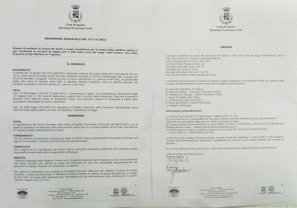 la segnalazione del Corpo Forestale dello Stato Comando provinciale di Perugia del 6/12/2015, con la quale si segnalava un’anomalia della temperatura dell’acqua in un pozzo freatico sito in Fraz. San Martino in Trignano presso delle abitazioni private;