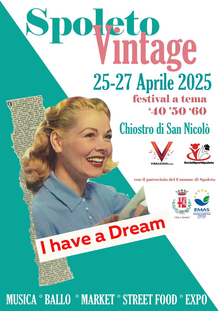 Dal 25 al 27 aprile 2025, il suggestivo Chiostro di San Nicolò a Spoleto ospiterà “Spoleto Vintage – 40′ 50′ 60′”, un evento dedicato alla cultura e allo stile degli anni ’40, ’50 e ’60. Organizzata Vibrazioni Eventi in collaborazione con Social Sport e con il patrocinio del Comune di Spoleto, la manifestazione mira a offrire un’esperienza coinvolgente che unisce diverse generazioni attraverso attività ricreative, shopping e momenti culturali.
