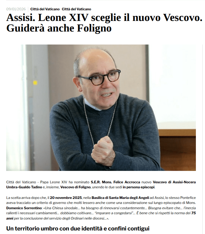 Ma colpiscono le tempistiche celeri – e anche la scelta dei tempi: domani si apre l’ottocentenario francescano – della vicenda. Dopo aver ricevuto l’incarico di guidare anche Foligno, anno domini 2021, nel 2023, compiuti i 75 anni, in conformità a quanto dispone il codice di diritto canonico Sorrentino aveva rassegnato le dimissioni a Papa Francesco che le aveva accettate Nunc Pro Tunc, ossia con effetto solo dalla data di pubblicazione della nomina di un successore. “L’ho fatto con la pace nel cuore e pronto a ogni decisione del Santo Padre”, aveva spiegato all’epoca, per poi aggiungere che qualche settimana dopo, con una lettera a firma del nunzio apostolico in Italia, Emil Paul Tscherrig, il Santo Padre ha comunicato a Sorrentino che il suo mandato è prorogato per i prossimi anni. Nella lettera rivolta a mons. Sorrentino, il Nunzio precisa che si “proroga il suo governo di due anni, alla fine dei quali si valuterà l’opportunità di un coadiutore”.