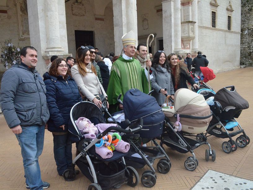 È stata celebrata domenica 8 febbraio nel Duomo di Spoleto la Messa per i nati nell’anno 2014 nel reparto di Ginecologia ed Ostetricia dell’Ospedale di Spoleto, secondo appuntamento della Giornata per la Vita (il primo è stato il convegno Racconta la Vita tenuto venerdì 6 febbraio). Sotto il portico della Cattedrale c’erano quattro ulivi sui quali sono state appese le foto dei bambini. L’arcivescovo Renato Boccardo ha accolto piccoli, mamme e papà in fondo alla chiesa, che in poco tempo si è riempita di persone e di carrozzine. La Messa è stata animata nel canto dal coro della pastorale giovanile della Diocesi. Presente il sindaco di Spoleto Fabrizio Cardarelli e il primario del reparto di Ginecologia ed Ostetricia Fabrizio Damiani.
