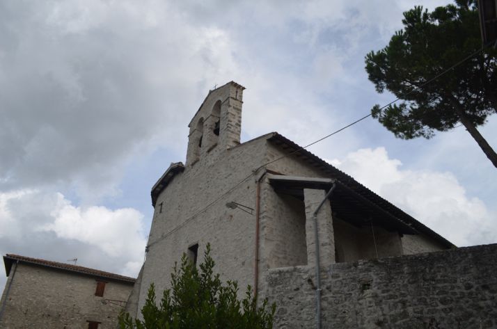 Alcune note storiche sulla chiesa. La prima notizia dell’esistenza della chiesa viene dai registri delle decime del contando di Spoleto raccolte da Pietro Sella nel Rationes decimarum Italiae nei secoli XIII e XIV, Umbria (Città del Vaticano, 1952), che riporta la villa di Acquaiura in cartografia con il simbolo della chiesa. Successivamente l’edificio di culto viene citato nella Visita pastorale del Pelosius (seconda metà del 1300) come Sant’Angelo di Acquviuola, antico toponimo della località, facente parte della Pievana di San Pietro in Montanis e dotata di curato. Più tardi la si trova nel catasto del 1401 nel repertorio degli enti ecclesiastici ed ospedali: possedeva ben 28 appezzamenti di terreno, tra boschi, vigne e terre coltivate o al sodo. Si trattava quindi di una chiesa piuttosto importante nonostante la posizione decentrata. La chiesa è registrata anche nel catasto del 1545, quando conta ancora numerosi possedimenti. Dai vari documenti d’archivio disponibili e sulla base dell’analisi dell’edificio è stato possibile ipotizzare con relativa attendibilità la storia di questa chiesa. È verosimile che la sua forma attuale sia il frutto dell’ampliamento di una chiesa più piccola (quella citata sopra, ndr) corrispondente all’ambiente di ingresso, che appare, infatti, come un organismo autonomo per l’impianto murario, per il diverso orientamento (nord-sud) e per lo stacco nel disegno della pavimentazione. Probabilmente il nucleo originario della chiesa era una piccola edicola votiva con abside e altare, chiusa da una cancellata lignea (ancora presente), come ne esistono molte nel territorio. Probabilmente intorno alla metà del 1500 fu costruita la navata della chiesa attuale, addossata alla parete est della vecchia chiesa e messa in comunicazione con quest’ultima aprendo un varco nella parete stessa. Gli affreschi che decorano il presbiterio – che necessitano di un restauro – riportano una iscrizione con i nomi dei santesi che ne curarono l’esecuzione: due personaggi vissuti nella seconda metà del ‘500. Sulla base dell’analisi stilistica e dei confronto con altri lavori, sono attribuibili al pittore spoletino Piermatteo Gigli, mentre quelli della cappellina della Vergine sembrano della scuola dello Spagna. (Fonte: Relazione tecnica illustrativa per la manutenzione straordinaria della chiesa, novembre 2012).