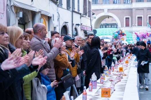 Tra i momenti più applauditi della tre giorni, il grande show cooking di Simone Rugiati, che sabato pomeriggio ha riempito il Chiostro di San Nicolò con uno spettacolo di tecnica, passione e racconto. Lo chef e conduttore televisivo ha condiviso con il pubblico la sua esperienza in Africa e il valore del cibo come legame autentico tra le persone. Applausi a scena aperta anche per il “Dolce da record”, che oggi pomeriggio ha trasformato Corso Garibaldi in un fiume di gente. L’Attorta spoletina da 60 metri, realizzata dagli studenti dell’Istituto Alberghiero “Giancarlo De Carolis”, è stata accolta da centinaia di persone, impazienti di assaggiarla. Un momento di festa popolare che unisce tradizione, scuola e comunità, simbolo perfetto dello spirito di Dolci d’Italia.