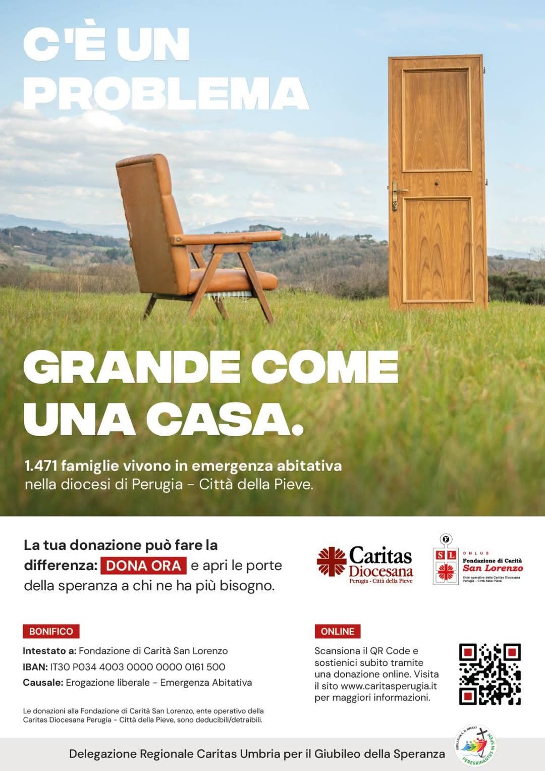 «Nell’anno del Giubileo della Speranza, credenti e non credenti, uomini e donne di buona volontà-generosità sono esortati ad aprire una porta di speranza a chi ne ha più bisogno». Ad auspicarlo è il direttore della Caritas diocesana di Perugia-Città della Pieve, don Marco Briziarelli, nel ricordare l’imminente colletta, in calendario domenica 30 marzo, IV di Quaresima, in tutte le parrocchie della Chiesa perugino-pievese per la Campagna raccolta fondi in aiuto a quasi 1.500 famiglie in emergenza abitativa. Questa Campagna, dal titolo “C’è un problema grande come una casa. Facciamoci casa”, è promossa dalle otto Diocesi dell’Umbria attraverso la Delegazione Caritas Regionale, avviata all’inizio della Quaresima e proseguirà per tutto l’Anno giubilare come “opera segno” di speranza.