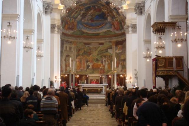 Oggi la Chiesa ha celebrato la solennità delle Palme, più propriamente detta la “domenica della Passione del Signore”. In tutti i luoghi di culto del mondo si è ricordato, dunque, l’ingresso di Gesù a Gerusalemme a dorso di un’asina: il simbolo di questa festa liturgica è il ramoscello d’ulivo benedetto, segno di pace. Con la domenica della Palme sono iniziate le celebrazioni della Settimana Santa, nella quale vengono celebrati e ricordati gli ultimi giorni di vita terrena di Gesù: i suoi tormenti interiori, le sofferenze fisiche, i processi ingiusti, la salita al Calvario, la crocifissione, la morte e la sepoltura e infine la sua Risurrezione. L’Arcivescovo di Spoleto-Norcia, mons. Riccardo Fontana, ha ripetuto questo antico gesto della benedizione della Palme a Montefalco, sabato 4 aprile in occasione della festa diocesana dei giovani, e nella chiesa cattedrale di Spoleto, domenica 5 aprile. Il presule nella sua omelia ha invitato le persone che gremivano il duomo a rimettersi in cammino verso la città di Dio, cioè verso il Paradiso. Alla cerimonia, animata dalla Cappella Musicale del Duomo, c’erano tutti i ragazzi della catechesi e i giovani delle parrocchie del centro storico di Spoleto. “All’avvio della Settimana Santa, ha detto mons. Fontana, è necessario mettere da parte la nostra superbia, la nostra prepotenza, la nostra volontà di fare sempre come ci pare. Dobbiamo tornare ad essere più credibili e veri. Non si può vivere solo pensando a se stessi. Basta, ha ripetuto, di badare solo all’immagine, di ricercare sempre il meglio: in vista della Pasqua ci è chiesto di spenderci per gli altri”. Il pensiero di mons. Fontana è andato anche a tutti i malati dell’arcidiocesi, “a coloro, ha detto, che fisicamente, ogni giorno, portano la croce”. L’arcivescovo ha richiamato la sobrietà negli stili di vita, ha invitato alla riscoperta della gratuità, ha esortato a non dimenticare chi si trova a vivere situazioni di difficoltà. Poi, il pensiero è andato a tutte quelle famiglie duramente colpite dall’attuale crisi economica. Nell’ultima settimana di marzo – la fatidica quarta settimana del mese, nella quale i soldi non bastano più – 320 famiglie del comprensorio spoletino si sono rivolte alla Mensa della Misericordia della Caritas per chiedere un aiuto alimentare, il cosiddetto ‘pacco viveri’. La grande generosità dei fedeli della Chiesa di Spoleto-Norcia, che nelle cinque domenica di Quaresima hanno raccolto pasta, legumi e altri generi alimentari, ha permesso di far fronte a questa emergenza. Mons. Fontana ha anche ringraziato i fedeli per la sensibilità che hanno mostrato al “Fondo di Solidarietà delle Chiesa umbre”, istituito dai vescovi dell’Umbria proprio per sostenere e farsi accanto a quelle famiglie maggiormente colpite dalla crisi, e alimentato anche con i soldi che sono stati raccolti domenica 29 marzo – nella grande colletta – in tutte le chiese della regione.