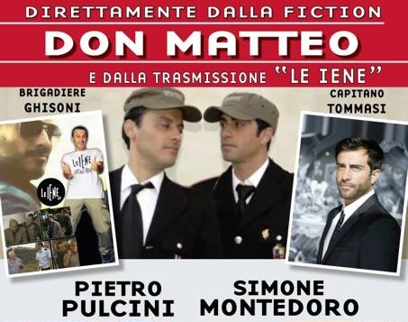 Pietro Pulcini è “La Iena” del Don Matteo. Protagonista e inviato del programma televisivo di Italia 1 “Le iene”e interprete nello storico ruolo del “brigadiere Ghisoni” insieme a Simone Montedoro, “il capitano Tommasi” nella fiction, ci regalano un viaggio ironico e divertente partendo dalla fiction di Rai1 Don Matteo… fino ad arrivare a una rivisitazione comica della classica intervista doppia “Le iene” di Italia1. Il tutto supportato dal performer Singer Mauro Antonelli ed il Chitarrista Sergio Giuffrida che interpreteranno vari medley d’omaggio a Terence Hill con le celeberrime colonne sonore dei suoi film, a Nino Frassica con vari medly del periodo di “Indietro tutta” e un medley finale dedicato alle canzoni d’amore. Il saluto canoro finale di Pietro Pulcini e Simone Montedoro chiuderà lo spettacolo musicale che si caratterizza fortemente per i molteplici spunti di comicità geniale e di garbata ironia.