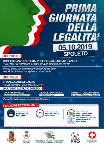 Doppio appuntamento sabato 5 ottobre a Spoleto, per celebrare la Prima Giornata della legalità. Dalle ore 10, nell’Aula Magna della Istituto per Sovrintendenti della Polizia di Stato, si terrà una conferenza rivolta ai docenti e alunni degli Istituti Superiori di Spoleto su “La legalità dai banchi di scuola al mondo del web”.