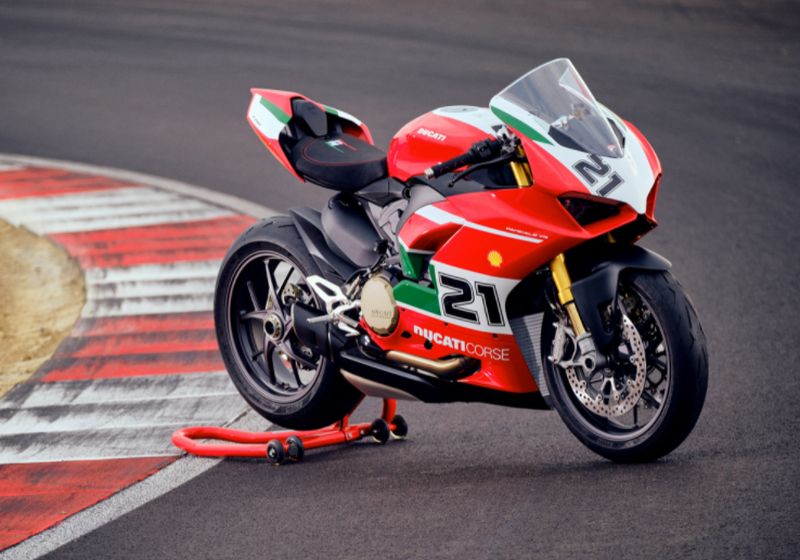 La forcella NX30 e l’ammortizzatore posteriore TTX36 garantiscono massima scorrevolezza e sono progettati per ottenere le migliori prestazioni in circuito, con un assetto che rende la moto più precisa e offre al pilota un maggior feeling e un maggior supporto in tutte le fasi di guida. L’ammortizzatore di sterzo, grazie alle regolazioni di cui è dotato, permette di personalizzarne la taratura adattandola allo stile di guida e alle caratteristiche del tracciato. Rispetto alla versione standard, la Panigale V2 Bayliss 1st Championship 20th Anniversary è anche più leggera di 3 kg, grazie all’adozione della batteria agli ioni di litio e alla scelta della configurazione monoposto che richiama esplicitamente il look della moto da gara (sella passeggero e pedane sono disponibili nell’equipaggiamento a corredo). L’equipaggiamento è completato dalle manopole sportive, dalla cover del finale del silenziatore in fibra di carbonio e titanio e dalla sella pilota realizzata abbinando due diversi materiali tecnici con doppia cucitura rossa. Sulla sella è ricamato il numero 21 di Troy in bianco affiancato da due bande verticali di colore verde e rosso a comporre la bandiera italiana. La moto monta inoltre le pompe freno e frizione autospurganti con serbatoi olio in colorazione fumè. La moto è stata presentata ufficialmente da Ducati attraverso un episodio speciale della Ducati World Première realizzato al Museo Ducati, in pista e a casa di Bayliss in Australia.