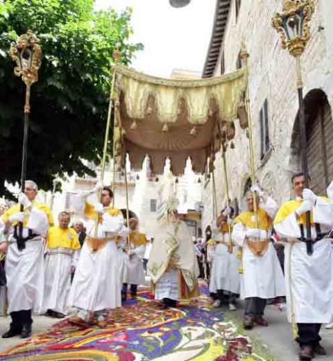 Sono già al lavoro, e lo saranno per tutta la notte gli infioratori che a Spello stanno dando vita ad un'esplosione di profumi e di colori con tappeti e quadri fioriti composti da milioni di petali, ordinati con pazienza dalle abili mani di chirealizza l'Infioratadi Spello, gli infioratori, appunto. Già dalle prime luci dell'alba turisti, visitatori e fotografi potranno tornare a circolare sempre più numerosi lungo le vie della città: tutti sanno che le splendide opere floreali possono essere ammirate per pochissime ore, prima che la solenne processione del Corpus Domini (alle ore 11, dopo la celebrazione della messa nella Chiesa di Santa Maria Maggiore) le calpesti come vuole la tradizione religiosa. Dopo il passaggio del sacro corteo, quest'anno presieduto da monsignor. Gualtiero Sigismondi, vescovo di Foligno, la domenica prosegue allegramente e tutta la città continua ad assaporare e a condividere, fino alle simboliche premiazioni della sera, la magia di questa esperienza di altissimo valore artistico e umano. Tra i primi appuntamenti domenicali, alle 9, ci sono l'annullo filatelico, in piazza della Repubblica, sotto il portico del Palazzo Comunale, e l'emissione della scheda telefonica che Telecom Italia, in tiratura limitata, dedica alla Splendidissima Colonia Julia. Un tappeto multicolore e le torri di Properzio sono i soggetti scelti per la prepagata da tre euro, acquistabile in piazza della Repubblica presso lo stand “Call Action”. In attesa delle premiazioni del pomeriggio, i visitatori si riposano sulle panchine e si ristorano nei ristoranti. Si riconferma regina delle mostre, anche quest'anno, la mostra mercato di florovivaismo allestita nei giardini pubblici. Alla sua quarta edizione, la mostra è già divenuta un punto di riferimento per tutti gli appassionati e i professionisti del verde, che sono accorsi in migliaia durante tutta la notte attratti dal ricco assortimento di produzioni tipiche e di qualità provenienti dall'Umbria e da altre regioni italiane: piante grasse, specie da collezione e piante carnivore, tillandsie, pelargonium a foglia odorosa e gerani in genere, piante mediterranee e tropicali in vaso, rose protee, piante di agrumi eduli, ornamentali e di interesse storico, nonché produzioni e collezioni di lavande aromatiche. Musei, mostre, negozi ed esercizi commerciali restano aperti fino alla sera: Mostra di ricamo floreale e dei bozzetti nel Museo delle Infiorate (Palazzo Comunale, Piazza Repubblica), Mostra di arte fotografica (Centro Commerciale La Chiona-Superconti). E alle ore 18 circa (un po' di elasticità è ammessa dopo una veglia di quasi oltre trentasei ore), il palco allestito in piazza della Repubblica ospiterà la cerimonia delle premiazioni del 48° concorso delle Infiorate. Il vincitore assoluto – in base a criteri di esecuzione tecnica, soggetto ed originalità – riceverà l'ambito Trofeo Properzio, la statuetta in bronzo che ogni anno viene consegnata al nuovo gruppo vincitore.