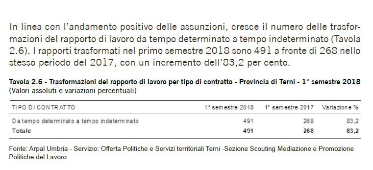 L’incremento, che riguarda entrambi i sessi, si concentra tra le persone di cittadinanza italiana mentre per i lavoratori stranieri si rileva una flessione dell’1,6 per cento. Per i cittadini stranieri si rileva una contrazione del numero dei rapporti di lavoro attivati pari all’1,0 per cento. Essa riguarda unicamente il territorio di Terni (- 2,8 per cento) mentre per quello di Orvieto si riscontra un incremento del 6,1 per cento. In linea con l’andamento positivo delle assunzioni, cresce il numero delle trasformazioni del rapporto di lavoro da tempo determinato a tempo indeterminato. I rapporti trasformati nel primo semestre 2018 sono 491 a fronte di 268 nello stesso periodo del 2017, con un incremento dell’83,2 per cento.
