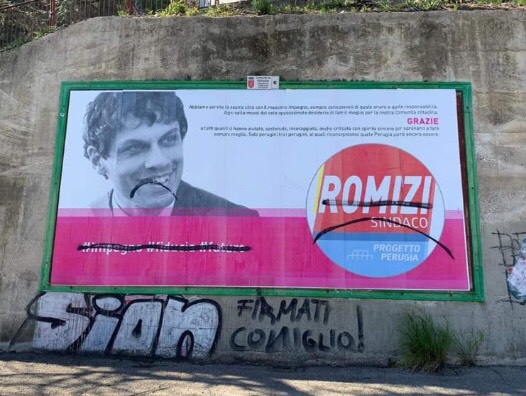 La foto che ritrae il primo cittadino sorridente è stata imbratta con uno “smile” alla rovescia: per l’autore-artista, nel fare un bilancio dell’amministrazione che ha governato Perugia negli ultimi 5 anni, ci sarebbe insomma poco da ridere. Stessa sorte per il simbolo “Romizi sindaco”, mentre sono stati cancellati gli hashtag “impegno“, “fiducia” “futuro” usati come parole chiave per la campagna elettorale.