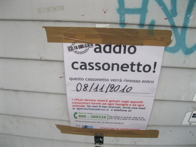 Ma torniamo al problema. La Valle Umbra Servizi da qualche giorno ha iniziato a togliere gradualmente dalla strada tutti i cassonetti in metallo dell’indifferenziata e differenziata, sostituendoli via via coi bidoni verdi (vetro), marroni (organico), quando va bene blu (plastica) e gialli (carta) e, per l’appunto, i mitici rossi-pannolino (o pannolone). Totalmente assenti quelli della indifferenziata, se non fosse per l’unico cassonetto “miracolato”, sopravvissuto a un “assalto” tanto veloce quanto silenzioso, situato davanti alle scuole e che, secondo l’avviso affisso sullo stesso, sarebbe stato rimosso entro lunedì 8 novembre. “Fortuna” vuole che sia ancora lì, solo soletto, a far tutto lui.