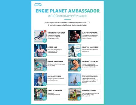 I Planet Ambassador di ENGIE Italia sono Francesca Bagnoli, kitesurfer, Gigi Datome, capitano della Nazionale di basket, Ivana di Martino, ultramaratoneta e coach, Christof Innerhofer, sciatore, Federica Mingolla, climber, Marco Orsi, campione di nuoto, Francesco Puppi, mountain trail runner, Arianna Talamona, nuotatrice paralimpica, Martina Valmassoi, freerider e Alessia Zecchini, campionessa mondiale di apnea.
