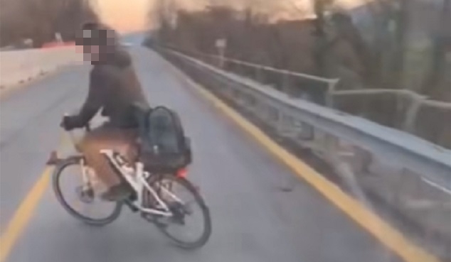 L’uomo, tuttora ignoto, ha almeno avuto “l’intelligenza” di far passare tutte le auto provenienti dal senso opposto prima di riprendere la via del ritorno. Il video, ora diventato virale sui social, potrebbe essere utile alle forze dell’ordine per rintracciare l’incauto ciclista che, secondo quanto previsto dal Codice della strada, non rischierebbe che una multa di appena 41 euro.