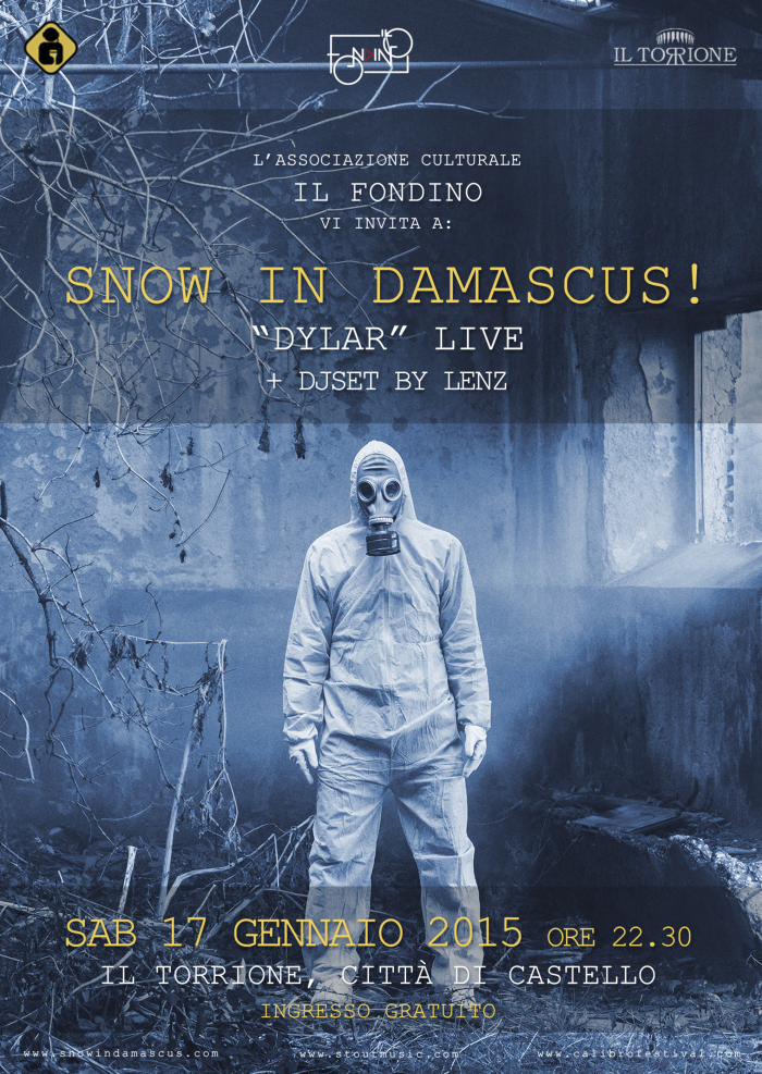 Ascoltare buona musica e sostenere un’iniziativa culturale. Questo, in sintesi, il succo della serata che sabato 17 gennaio vedrà il gruppo tifernate degli “Snow in Damascus!” esibirsi per la prima volta a Città di Castello, e presentare al pubblico l’album “Dylar”. Il concerto nasce in collaborazione con l’Associazione culturale “Il Fondino”, organizzatrice del festival CaLibro, e s’inserisce nel calendario d’iniziative per la raccolta fondi “Più siamo, più CaLibro”, finalizzata a costruire l’edizione 2015 della manifestazione letteraria.