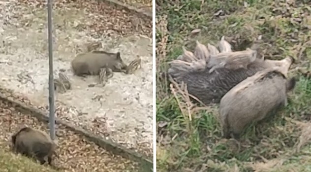 Nel filmato del primo cittadino gli animali vengono ripresi lungo il camminamento a due passi dal monumento ai caduti: qui la mamma si riposa placida con i cuccioli mentre il padre sembra essere alla ricerca di cibo tra la vegetazione. Nel video una voce “riconosce” anche l’esemplare “zoppicante”, già visto altre volte.