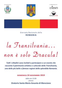 Torna a Marsciano l’appuntamento con l’evento che la comunità romena locale organizza in occasione della festa nazionale della Romania, che cade il primo dicembre, data in cui nel 1918 la Transilvania si unì al resto della nazione. Ed è proprio questa regione della Romania la protagonista della festa, dal titolo “La Transilvania… non è solo Dracula!”, che si terrà domenica 24 novembre a partire dalle ore 15.00 presso l’Oratorio Santa Maria Assunta.