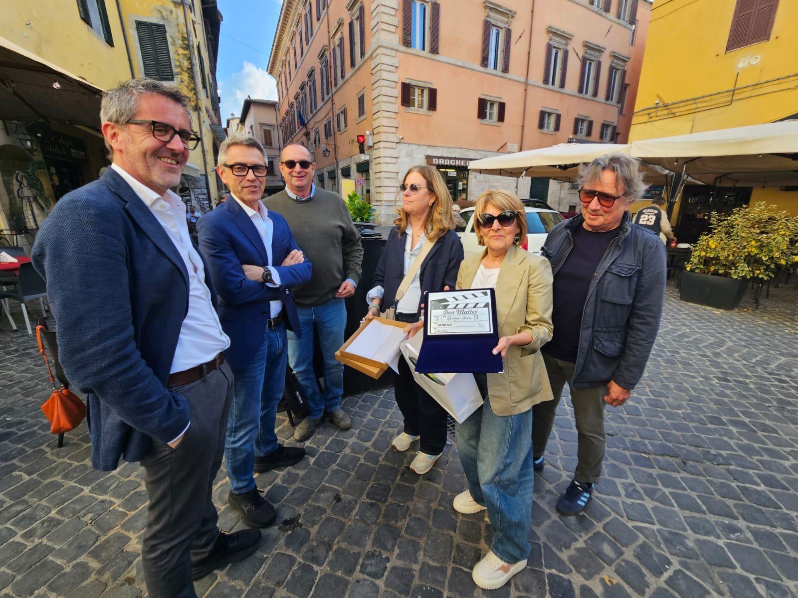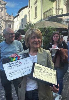 Anche i rappresentanti della società della famiglia Bernabei che realizza Don Matteo hanno donato alla Cedroni, in segno di stima e gratitudine, un prezioso foulard francese, una targa ricordo e un clapperboard (lo strumento con cui si da il ciak all’inizio delle riprese).