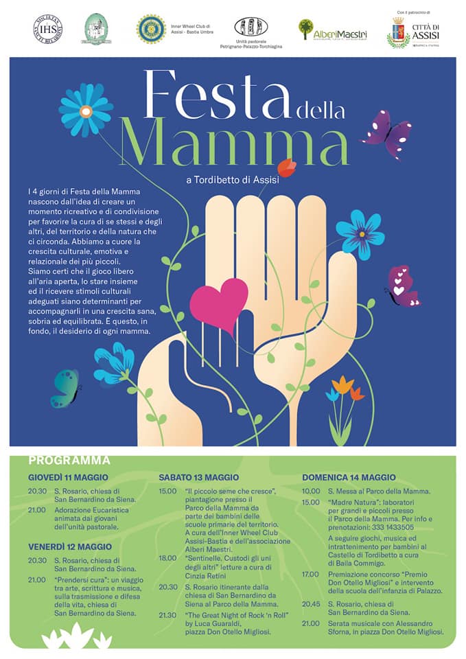 Tordibetto pronta a festeggiare la Festa della Mamma, nata proprio nella frazione assisana, alla fine degli anni ‘50, per volere di don Otello Migliosi. Oltre alle recite del santo rosario nella chiesa di San Bernardino e anche una versione itinerante fino al Parco della Mamma, in programma la piantumazione di fiori e piante, di letture, di iniziative per bambini tra gioco e cura dell’ambiente e anche di musica, con “The Great Night of rock and roll” di Luca Guaraldi in Piazza Don Otello Migliosi (alle 21.30 di sabato 13 maggio) e la serata musicale con Alessandro Sforna (alle 21 di domenica 14 maggio).