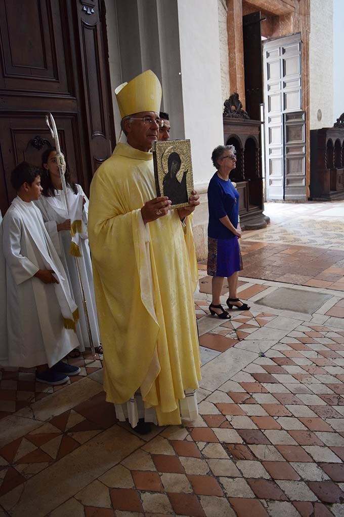 La sera precedente, il 14 agosto, si è tenuta sempre Spoleto, dalla Basilica di S. Gregorio a quella Cattedrale, la processione dell’Assunta presieduta dall’arcivescovo Boccardo. Come da antichissima tradizione, è stata portata nelle strade della città l’immagine venerata ed amata della Santissima Icone che, ancora una volta, ha visitato il suo popolo, elargendo a tutti luce e grazia. Questa immagine è stata donata a Spoleto da Federico Barbarossa nel 1185 in segno di pace. Da allora, in ogni stagione, gli spoletini hanno guardato ad essa come alla loro Signora, alla loro sicura difesa, al loro bellissimo vanto. Giunti in Cattedrale, l’Arcivescovo ha pronunciato, inginocchiato dinanzi alla Santissima Icone, una supplica alla Vergine Maria, implorando per la gente di Spoleto e di tutta la Diocesi il dono prezioso di una fede libera, forte, gioiosa ed operosa e di uno sguardo limpido e vero sulla realtà. In un passaggio mons. Boccardo ha fatto riferimento al momento di confusione e precarietà che stiamo vivendo: «Si sono bruciati – ha detto – molti degli ideali nobili e generosi che hanno un tempo infiammato i cuori e le fantasie: l’ideale di una Patria resa grande dalla concorde passione dei cittadini; l’ideale di una società dove le riforme delle strutture riescano a debellare l’egoismo dei privati e ad instaurare finalmente la giustizia; l’ideale di una convivenza umana senza squilibri, senza miseria, senza disperazione. Siamo – ha proseguito – continuamente sollecitati dalla ricerca di una “libertà senza verità”, che insidia l’uomo nella sua stessa dignità e persino nella sua sopravvivenza: le fantasie genetiche, il crollo della natalità, il disprezzo della vita umana dal suo concepimento fino al suo termine naturale, l’introduzione subdola di falsi criteri per definire l’identità sessuale della persona, la corrosione dell’istituto della famiglia e della sua espressione comunitaria, generativa e formativa, il permissivismo dilagante, l’indifferenza pratica di fronte a esodi di disperati costretti da persecuzione, guerra e miseria a cercare fortuna altrove, definiscono tragicamente il momento che viviamo. Tutta l’eredità del Vangelo – ha concluso il Presule – viene progressivamente ripudiata dalle legislazioni, irrisa da quanti gestiscono la pubblica informazione, scalzata a poco a poco dalle coscienze. In un momento tanto segnato da confusione e precarietà, fissiamo nel tuo sguardo materno i nostri occhi di figli e, come negli occhi dolci delle nostre mamme, cerchiamo indicazione, consolazione e speranza».