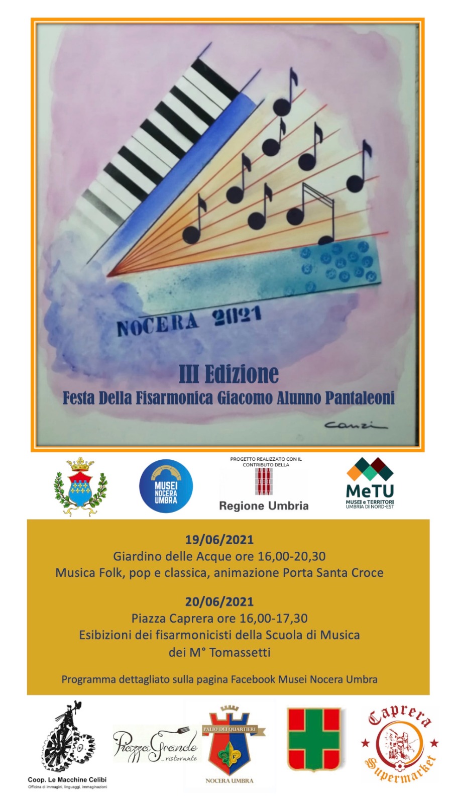 Nocera Umbra in festa per la terza edizione della ‘Festa della Fisarmonica – Giacomo Alunno Pantaleoni’. Si tratta di un evento, in programma il 19 e il 20 giugno, nello scenario del Giardino delle Acque. Dalle 16 alle 20.30 musica folk, pop e classica e l’animazione di Porta Santa Croce. Domenica 20, in piazza Caprera, l’esibizione dei fisarmonicisti della scuola di musica Tomassetti.
