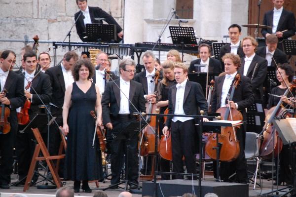 Eccolo Daniel Harding salire sul palco con la sua London Simphony Orchestra. Il Don Juan, come L’Uccello di Fuoco, non sono per la verità appropriati alla Piazza: già le ultime file della zona ‘vip’ stentano a sentire i virtuosismi degli straordinari orchestrali. Figurarsi quelli seduti in cima alla scalinata. A Palazzo Vincenti Mareri, messo gentilmente a disposizione di una ventina di giornalisti, non si sente nulla. Eppure son musiche di straordinaria bellezza. Eseguite magistralmente. La bacchetta di Harding agita il cielo della Piazza. E’ l’unica cosa che si ‘muova’ insieme ai piccioni che ormai hanno nidificato: le rondini, le naturali protagoniste di ogni concerto finale, stavolta se ne rimangono al di là del campanile del Duomo. Una sola, durante l’esecuzione di Stravinsky, ‘entra’ in piazza e compie uno, due, tre cerchi perfetti sopra il palco degli orchestrali. C’è chi vorrebbe interpretare quel volo, ma sono considerazioni solo dei più nostalgici. Di tutto ha bisogno il Festival tranne che di saccenti aruspici. Un lungo applauso saluta la fine della prima parte del concerto. Le signore ritoccano il trucco, i signori parlottano un po’ fra loro. L’orchestra è di nuovo pronta per la Sinfonia n. 2 di Brahms, l’opera scritta durante un soggiorno sulle Alpi austriache e che non a caso è stata spesso paragonata alla Pastorale di Beethoven. Eccole le rondini. Tagliano in due la piazza, il loro garrito sembra offuscare le magiche note. Comincia a piovere. L’arco del primo violino da il segnale agli orchestrali: bisogna abbandonare il palco. In piazza si aprono gli ombrelli. I più decidono di attendere: la Matrigna sembra non avere la meglio. I meno invece si avviano a prender posto alle cene di gala. Sul palco sale Giorgio Ferrara, indossa una camicia colorata poco adatta per il Concerto finale. Ma anche a questo forse si farà l’abitudine. “Il maestro Harding chiede 10 minuti di tempo, poi il concerto riprenderà”. E così è. La magia di Brahms riempie Piazza del Duomo. Di rondini e piccioni ora non c’è più traccia. L’orchestra si ferma. E’ finita. E la Piazza esplode in un lungo applauso.