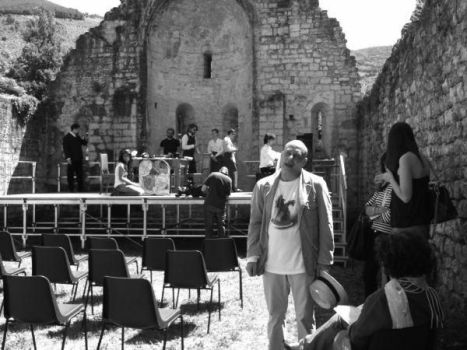Campello sul Clitunno (F.D.A.) – Il freddo e la pioggia si scontano particolarmente tra le rovine di San Cipriano, di fronte alle fonti del Clitunno, dove per il Festival dei 2 Mondi è in scena in questi giorni lo spettacolo “Tempo di Scirocco”, del regista Stefano Alleva, ormai spoletino di adozione. Fin troppo facile la battuta: a guardar il cielo si poteva pensare, a dispetto di aver superato ormai la seconda decina di giugno, alla messa in scena di “tempo di tramontana”. Acqua e pioggia non hanno interrotto la messa in scena delle prime due serate di “Tempo di scirocco”, ma la platea era decisamente troppo poco affollata per quanto merita lo spettacolo, scritto (insieme ad Alleva) e interpretato dalla piccola compagnia dell’Associazione Culturale Harvey. La rappresentazione è l’omaggio che Alleva e i suoi attori hanno voluto dare alla figura di Ernesto Ragazzoni, giornalista, autore e personalità bohèmien degli anni a cavallo tra 800 e 900. “Un uomo dalla libertà di pensiero assoluta”, lo ricorda Alleva. “Avendolo scoperto del tutto casualmente me ne sono innamorato e ho trovato una personale corrispondenza con il suo modo di essere e con la sua strepitosa fantasia”, spiega il noto regista a Tuttoggi.info. Nasce così lo spettacolo: invece di un reading delle stranissime quanto acute poesie del cronista (la più nota, “Il verme solitaro”), decide di mettere in scena una Redazione giornalistica, ambientata nel 1919, attraverso la quale far raccontare Ragazzoni e i suoi scritti. Uno scenario suggestivo, una location indovinata che diventa “protagonista” grazie allo scenario dei ruderi di San Cipriano, alla loro illuminazione e al naturale e costante brusio del fiume e delle fronde che acompagnano la recitazione.