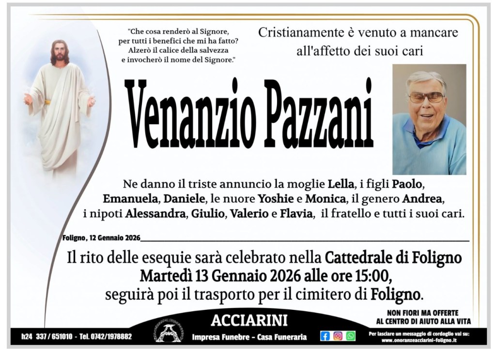 I funerali saranno celebrati martedì 13 gennaio alle 15 nella Cattedrale di San Feliciano.