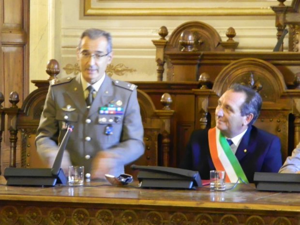 La città di Foligno, rappresentata dalle cariche istituzionali più importanti, ha dato ieri, in Consiglio comunale, il suo saluto di sincero apprezzamento e l’”in bocca al lupo” per il nuovo incarico al generale Maurizio Mattei. Presenti alla cerimonia consiglieri, assessori, rappresentanti delle associazioni di categoria, fino al Vescovo Sigismondi e al prefetto di Perugia, oltre, ovviamente, al sindaco di Foligno.