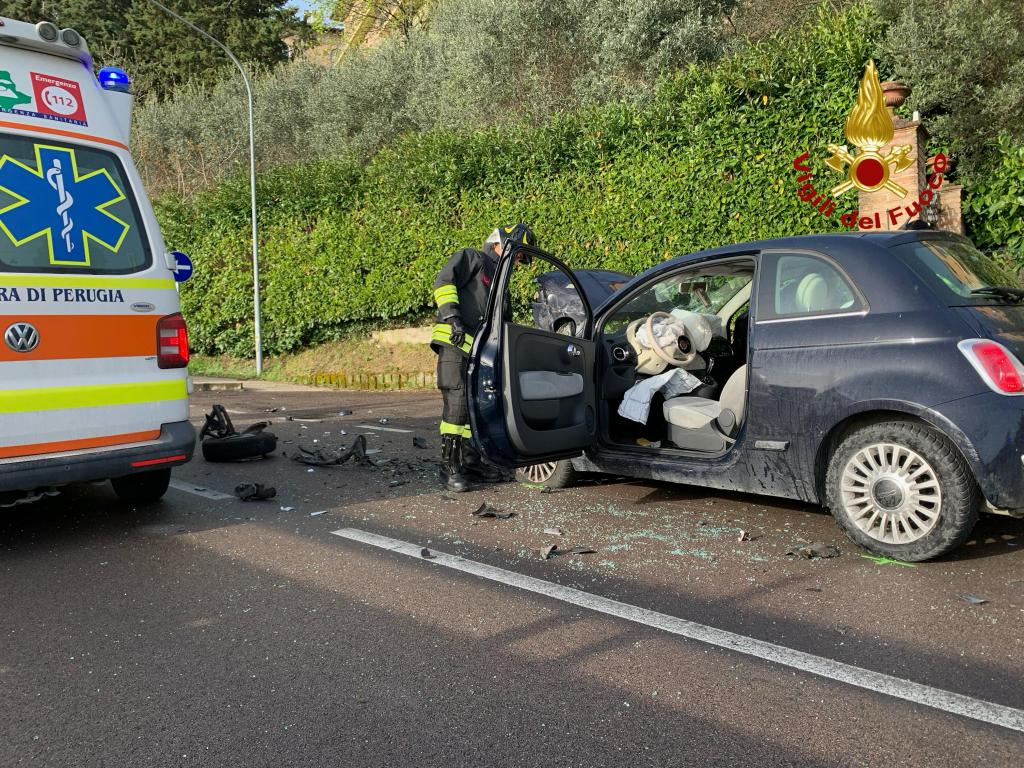 Brutto frontale tra auto questa mattina (16 aprile), intorno alle 8, in Via Tancredi Ripa di Meana (Perugia).
