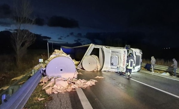 L’incidente, avvenuto intorno alle 5, ha coinvolto solo il mezzo pesante, il cui carico di gigantesche bobine di carta si è riversato sulla sede stradale.