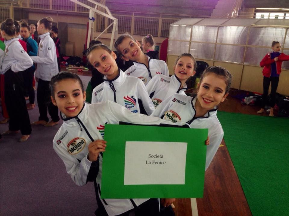 La squadra composta da Estelle Peneva Yurieva, Ludovica Scatena, Sara Jane Lipari, Claudia Cappelletti e Quondam Girolamo Camilla ha effettuato un’ ottima esecuzione al corpo libero ottenendo il punteggio di 12,700, non impeccabili invece gli esercizi al cerchio in coppia che ha totalizzato con il punteggio di 10,400 e la sequenza con fune e nastro per un punteggio complessivo di 9,050, l’ultimo esercizio alle clavette ha invece ottenuto punti 10,350 per un punteggio finale di squadra pari a punti 42,500. Sul podio nell’ordine l’Aurora Fano, la Ginnastica Fabriano e la Gymnall Pesaro, fra le squadre umbre si qualifica anche la Fortebraccio Perugia, 5^ con punti 42,650 e la Fulginium Foligno 7^ con punti 42,250.