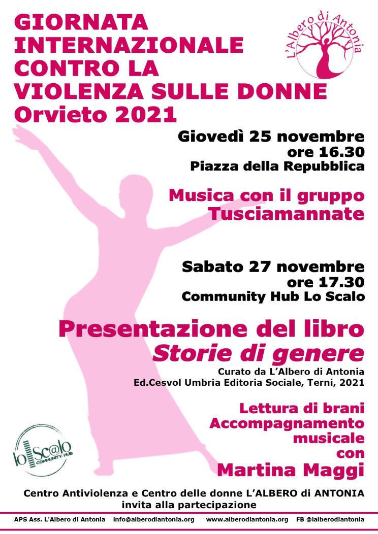 Appuntamento topico della ricorrenza è la presentazione del libro “Storie di genere” sabato 27 novembre alle ore 17.30, presso Lo Scalo -Community Hub di Orvieto Scalo. Il secondo volume scritto da L’Albero di Antonia, edito dal Cesvol-Centro servizi volontariato, è stato presentato a Umbria Libri a Terni lo scorso 29 ottobre.