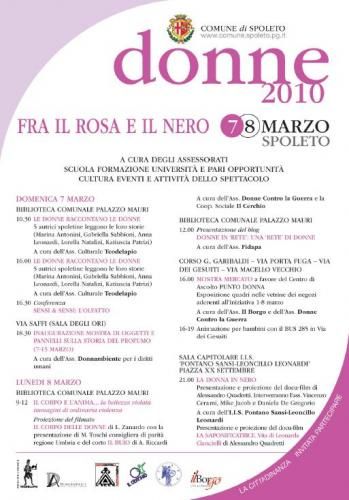 “Le donne raccontano le donne” è il primo appuntamento di “Donne 2010 – Fra il Rosa e il Nero”, la due giorni di eventi organizzata a Spoleto in occasione della Giornata Internazionale della Donna.